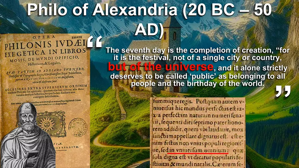 The seventh day is the completion of creation, for it is the festival, not of a single city or country, but of the universe, and it alone strictly deserves to be called 'public' as belonging to all people and the birthday of the world.